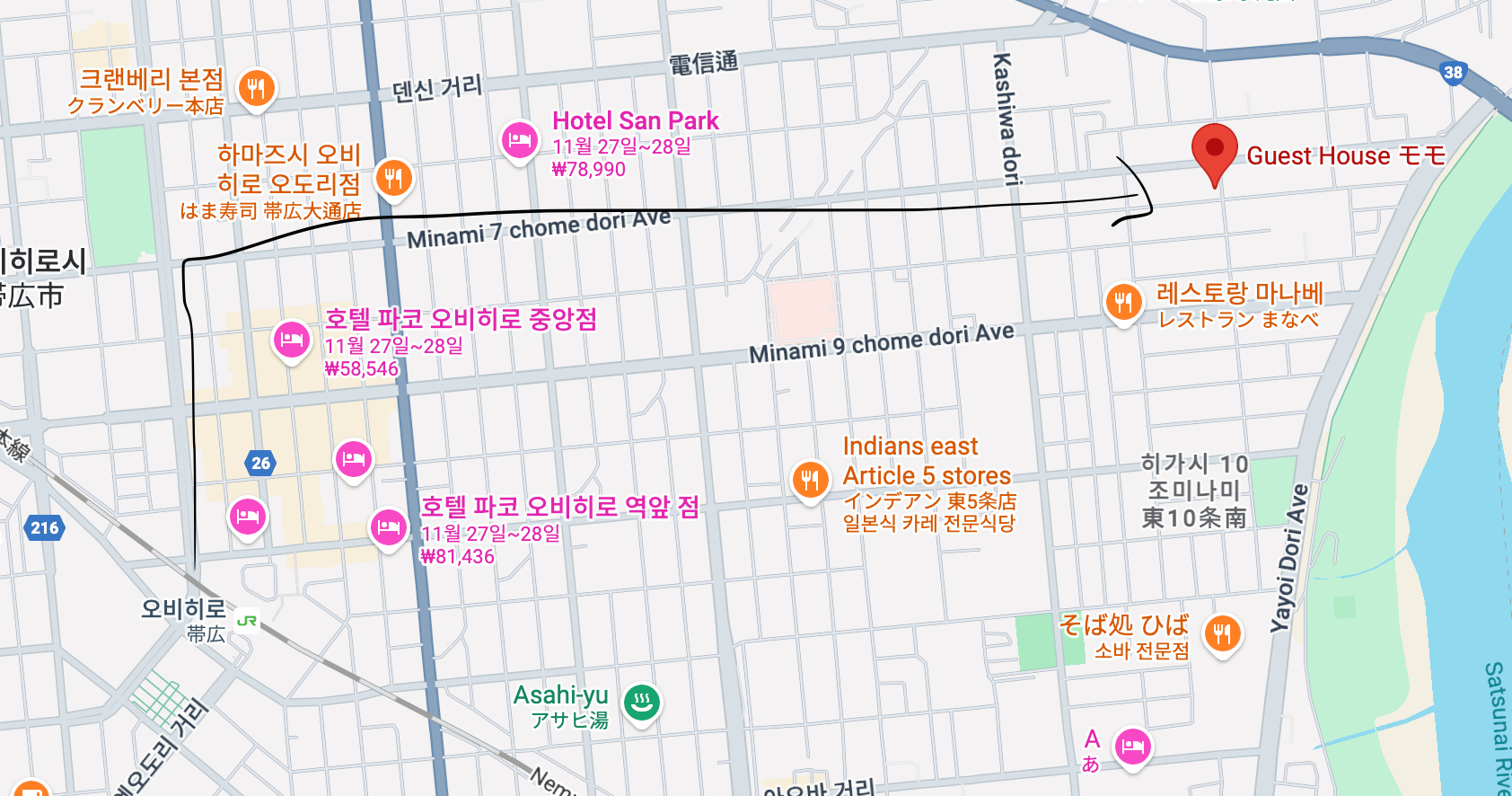 홋카이도는 대한민국 크기의 80%정도의 아주 거대한 크기의 섬(?)이다. 지도에서 봤을 때에는 내가 예약한 게스트하우스 정도는 한 15분정도 걸으면 도착할 것 같았다.